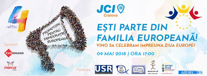 JCI Craiova îți transmite că și tu “Ești Parte din Familia Europeană!” Așa că, miercuri, pe 9 mai, de la ora 17:00, vino să celebrăm împreună ziua Europei la Craiova, în Mercur Center, etaj IV!